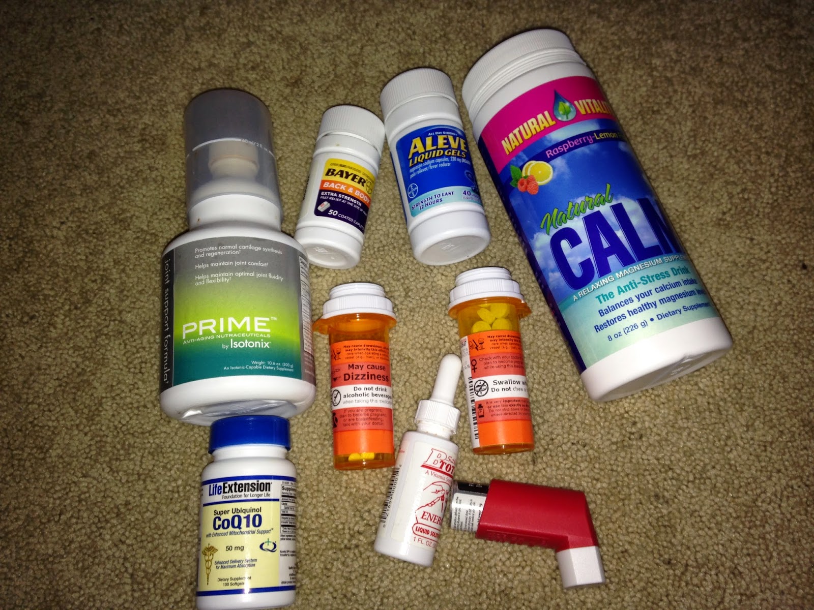 Jump to Fibro management: Aleve every 4 hours. The tag line says "all day relief" but for me it's exactly that..just a line. I get maybe 5 hours, but it sure does help while it's working. My vitamins and scrips at lunch and dinner. Nuun once in the morning and in the afternoon. And a couple sports beans in between.